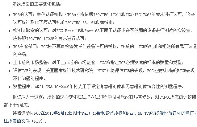 在2012年2月12日美国联邦通信委员会(FCC)提出的拟定法规提案的通告中,提出了对Part15和Part68规则中关于射频和终端设备检测及批准程序的重要变化。FCC认为,这些变化将简化审批程序,加快新设备投入市场的速度。