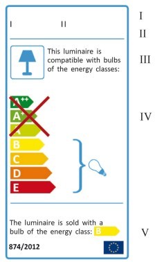V为适用情况下显示的句子内容,如:如果安装在灯具上的灯能由终端消费者替换,则灯的能效等级应包含在灯具的包装上。必要时,句子可调整至一个灯或几个灯上,且列出几个能效等级。如果灯具内仅包含一个不能由终端消费者替换的整体式LED模块,则灯上应标明警示语,以告知消费者灯不能替换。