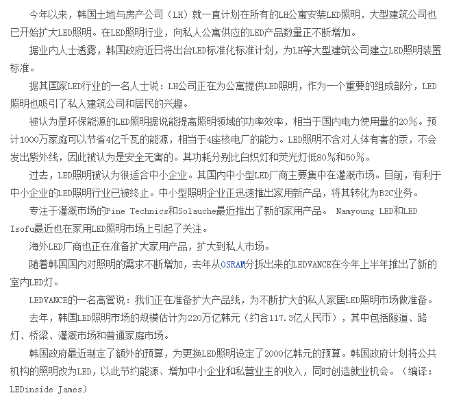 韩国将规范LED照明标准-民用市场前景看好